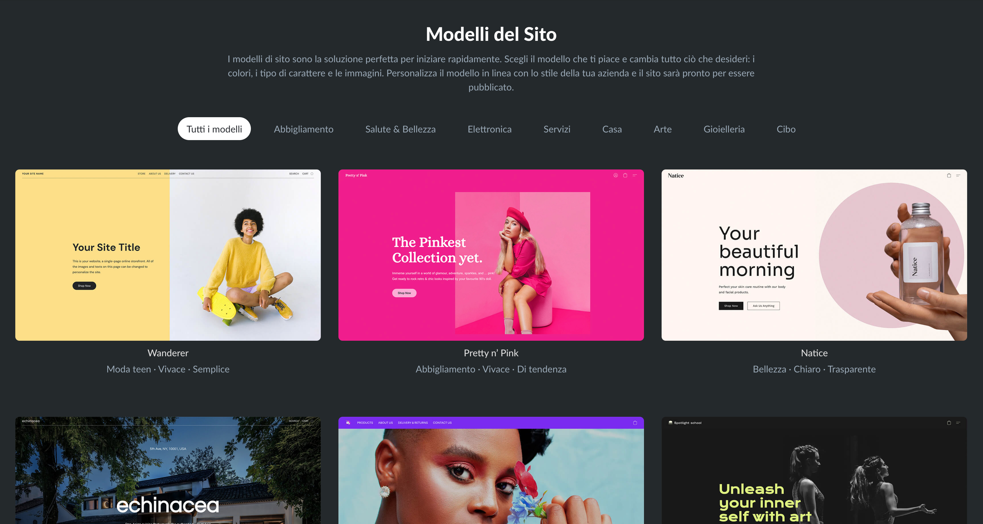 Questi sono solo alcuni di ecommerce template per Siti Istantanei di Ecwid. Vuoi vedere altri template? Crea un account Ecwid gratuito, poi entra nell’admin di Ecwid, Sito web → Modifica sito → Impostazioni → Modelli del Sito.