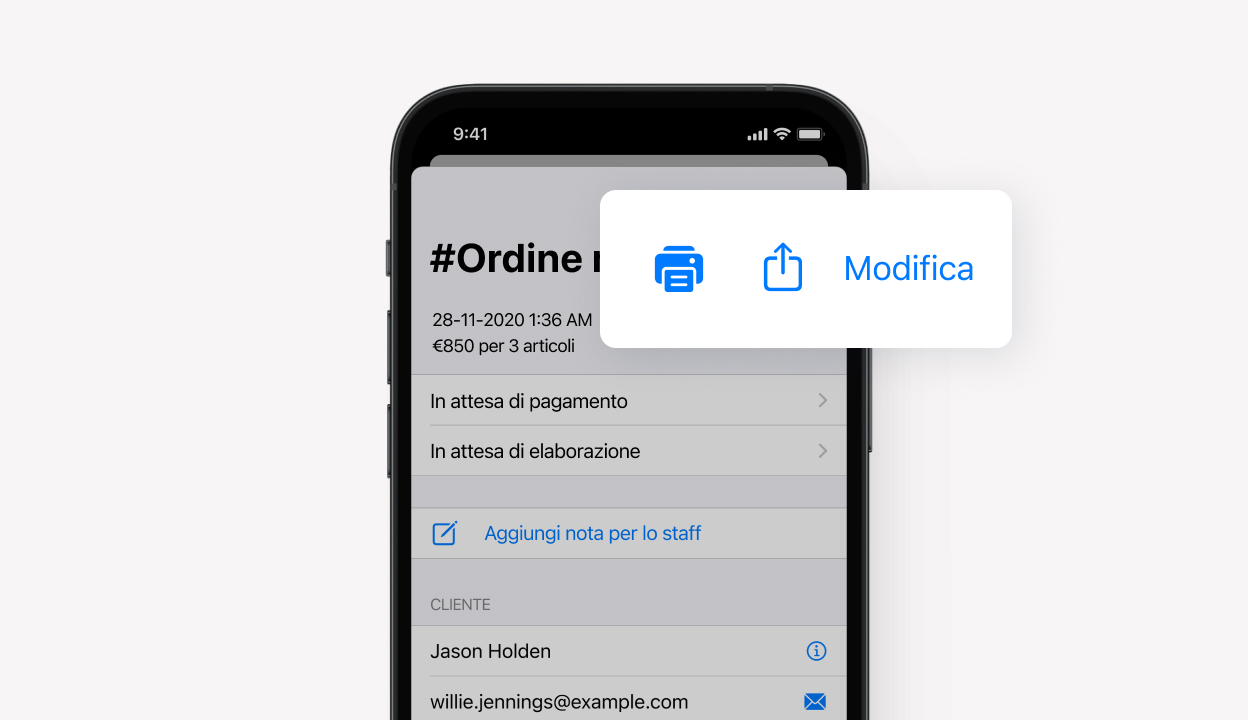 Contrassegnalo come spedito direttamente sullo smartphone. Aggiorna facilmente lo stato degli ordini, assegna numeri di tracciabilità o crea ordini offline senza alcun problema (soluzione perfetta durante gli eventi).