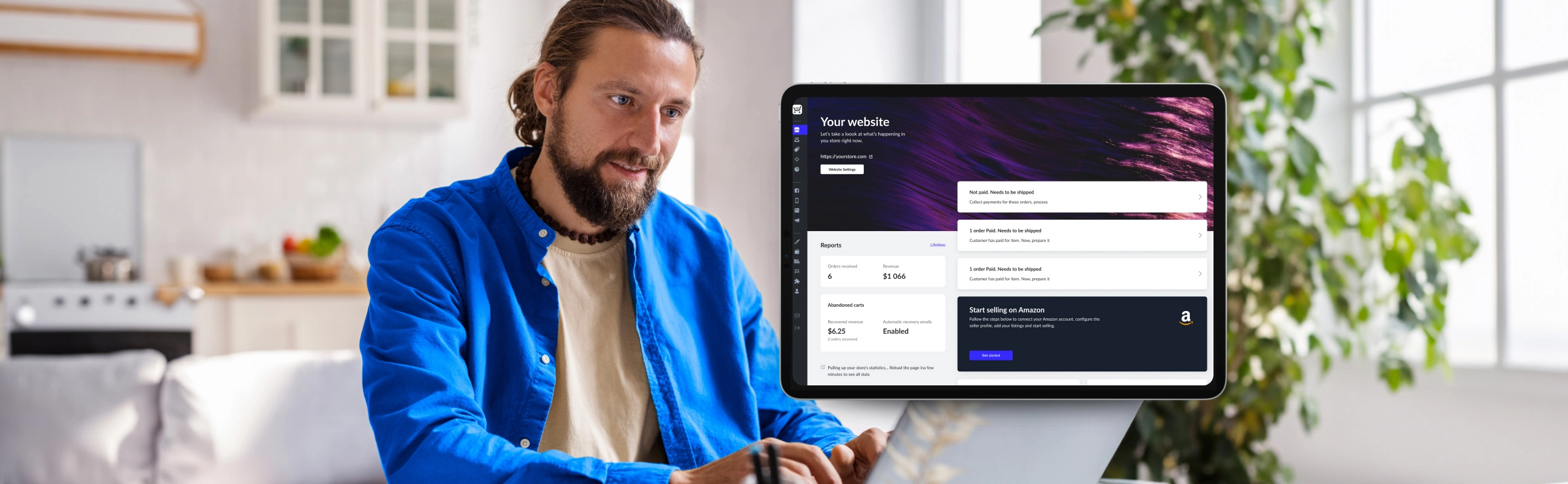 Sign up for Ecwid and start selling anywhere. Create a Facebook and Instagram store, sell on any website, upload your products to marketplaces like Amazon or eBay, and connect with customers in person. This can all be done from one simple control panel.