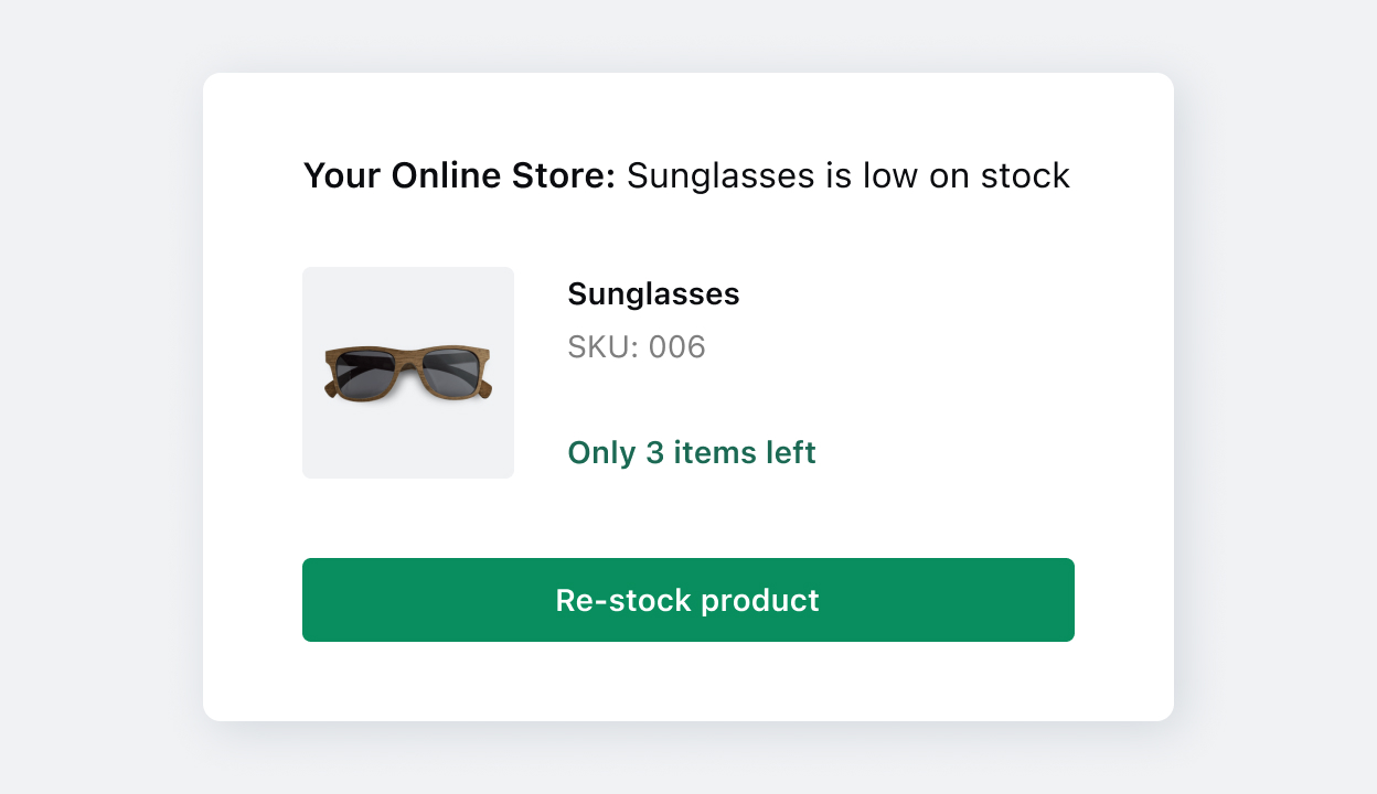 We'll send you a reminder when your inventory reaches a certain low level, ensuring you don't run out of stock unexpectedly and providing enough time to restock.